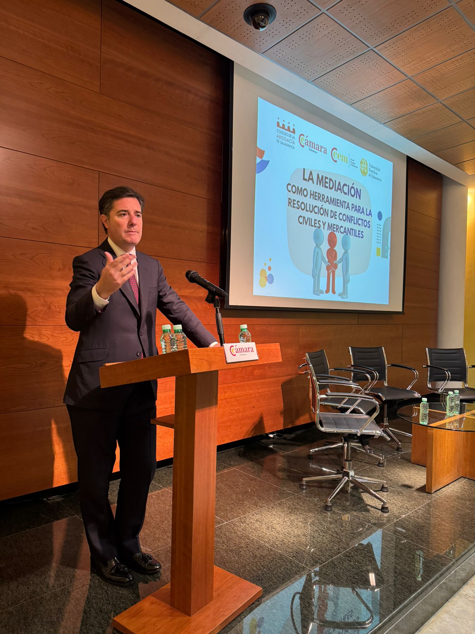El Centro Español de Mediación (CEM), la Cámara de Comercio de Salamanca, el Ilustre Colegio de la Abogacía de Salamanca y la Universidad Pontificia de Salamanca (UPSA) han celebrado la jornada “La mediación como herramienta para la resolución de conflictos civiles y mercantiles”, un encuentro orientado a compartir conclusiones y aprendizajes tras el primer año de la aprobación de la Ley Orgánica 1/2025, y a reforzar el papel de los Métodos Adecuados de Solución de Controversias (MASC), como la mediación, en la prevención y gestión eficiente de los conflictos.